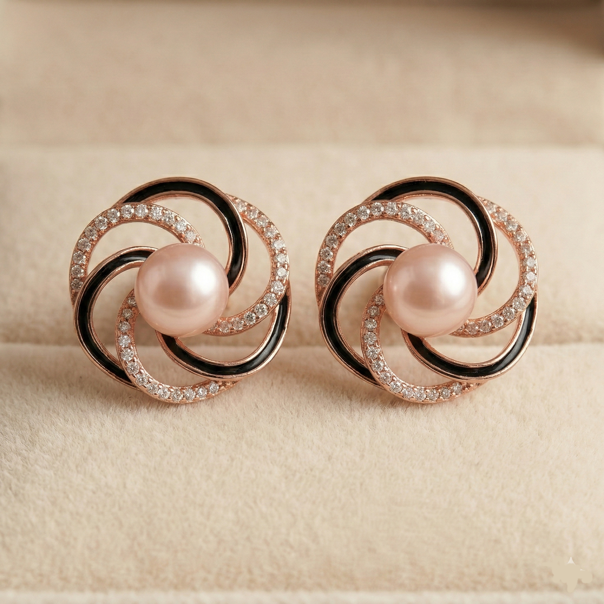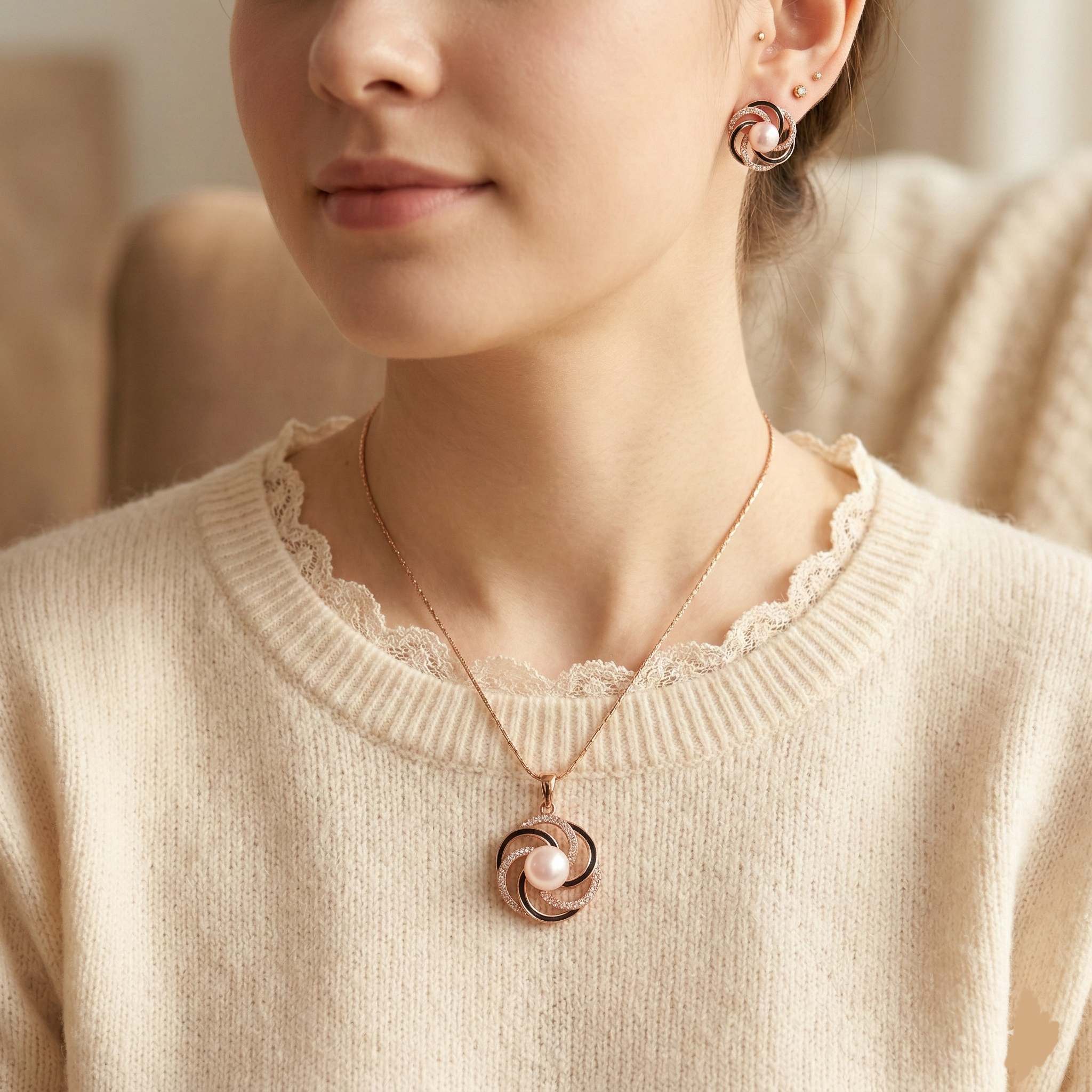EXCLUSIVE 925 SILVER ROSE GOLD POLISH BLACK ENAMEL WIT PEARL PENDANT SET