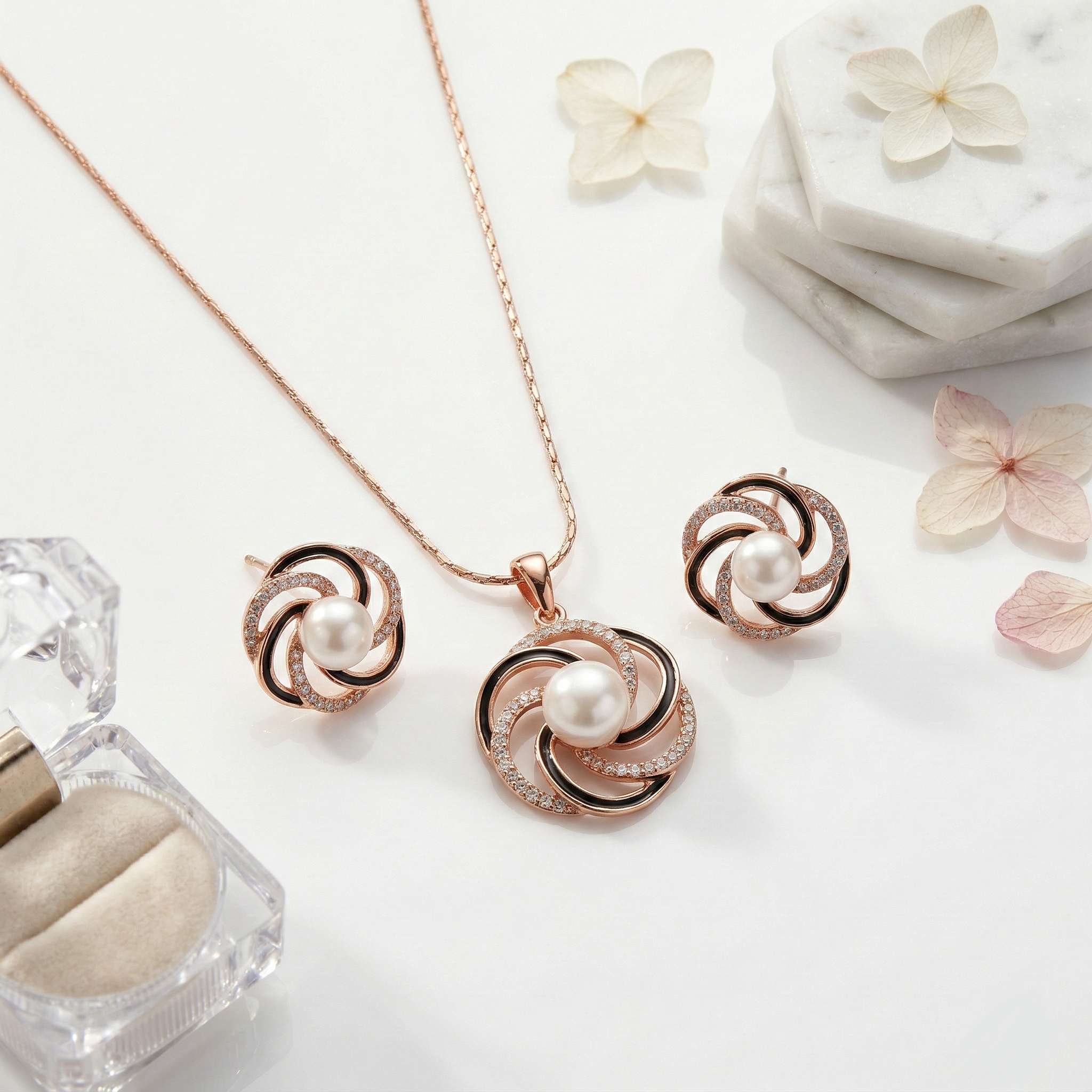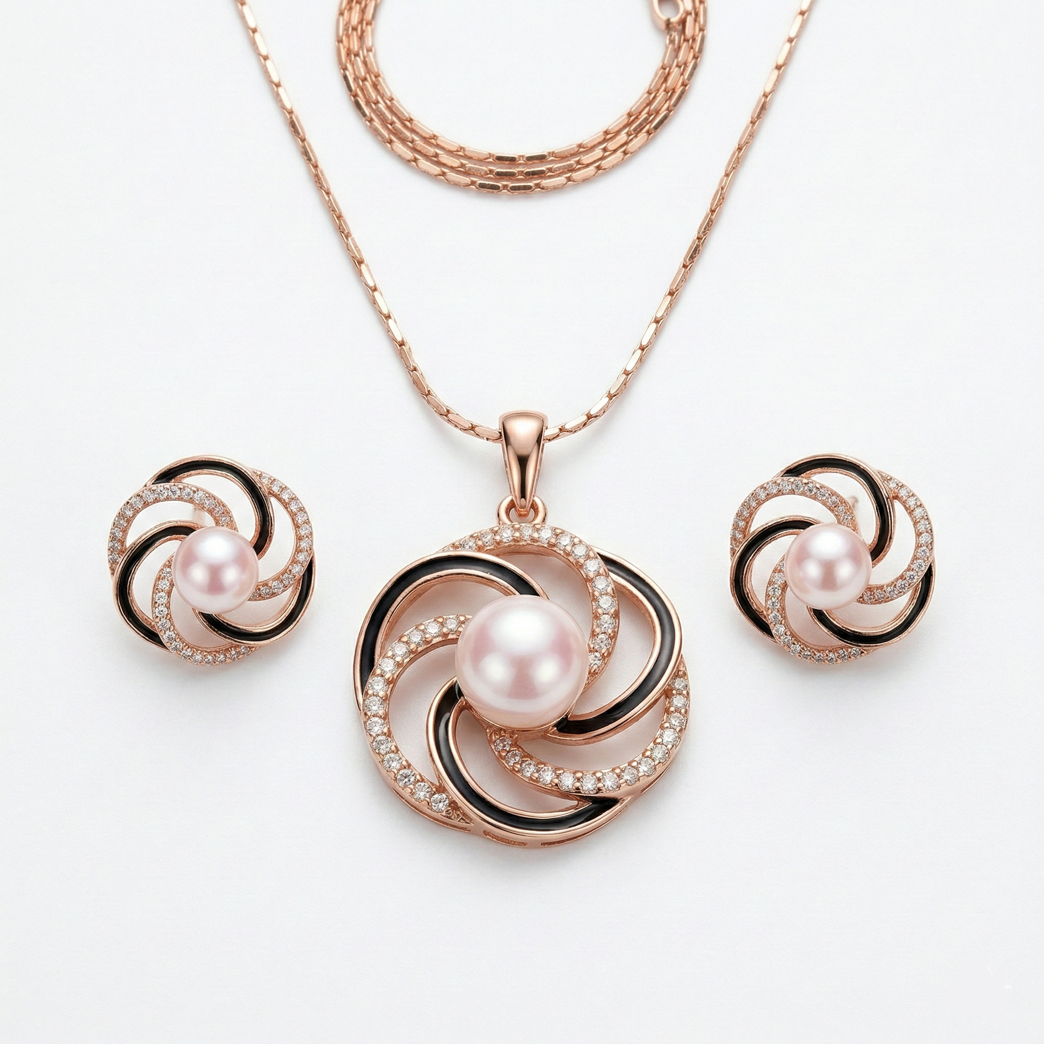 PREMIUM EXCLUSIVE 925 SILVER ROSRE GOLD POLISH PEARL PENDANT SET