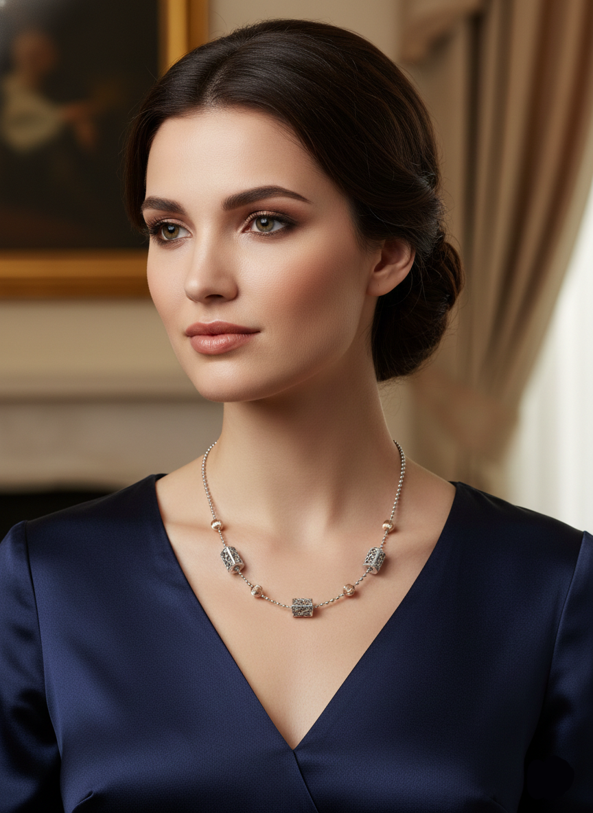 This AARYA Pure 925 Silver Necklace is elegantly crafted to showcase timeless beauty and refined craftsmanship. Made from premium quality pure 925 silver, it features a classic twisted design with a smooth, polished finish that enhances its natural luster. Designed for comfort and long-lasting wear, this necklace is perfect for everyday elegance while also adding a sophisticated touch to festive and special occasion outfits.