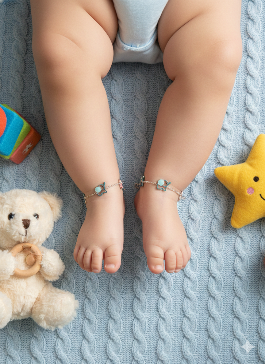 This AARYA Pure 925 Silver Baby anklete is elegantly crafted to showcase timeless beauty and refined craftsmanship. Made from premium quality pure 925 silver, it features a classic twisted design with a smooth, polished finish that enhances its natural luster. Designed for comfort and long-lasting wear, this Baby anklet is perfect for everyday elegance while also adding a sophisticated touch to festive and special occasion outfits.