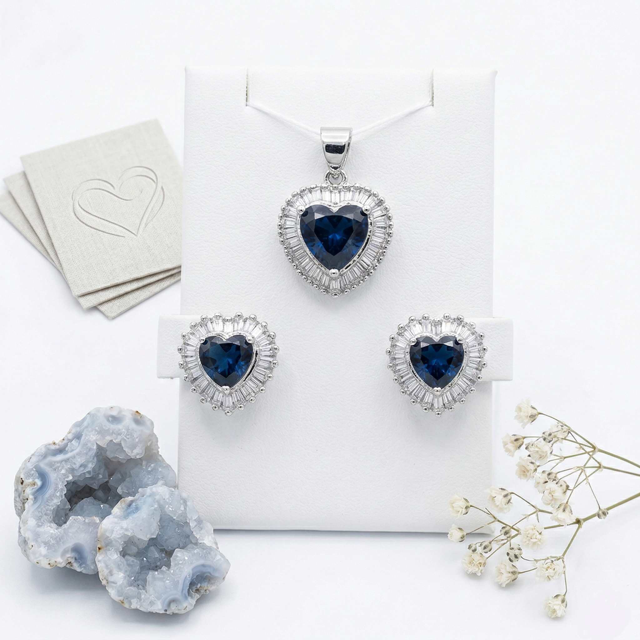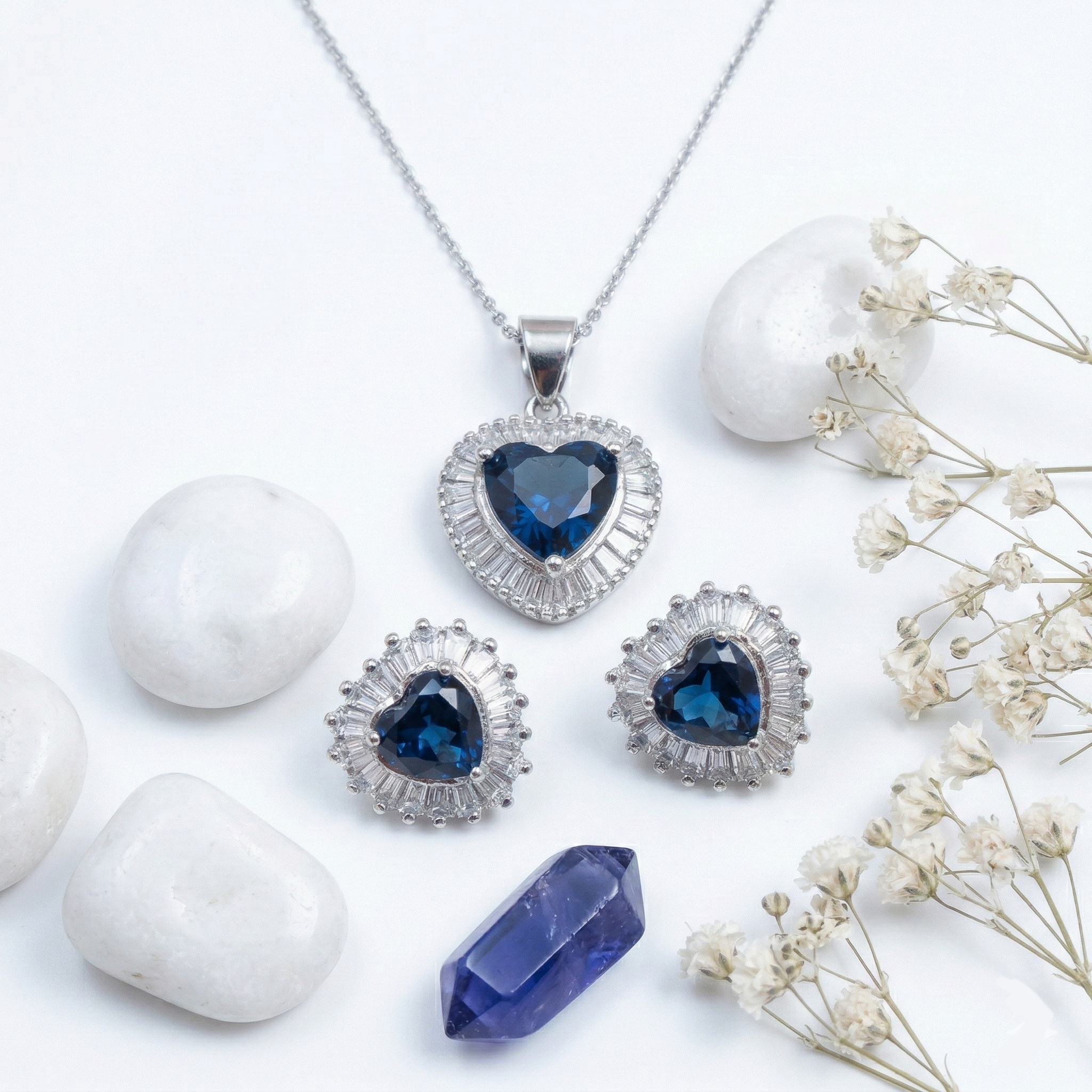 PREMIUM 925 SILVER OCEAN HEART ELEGANTE BLUE STONE PENDANT SET