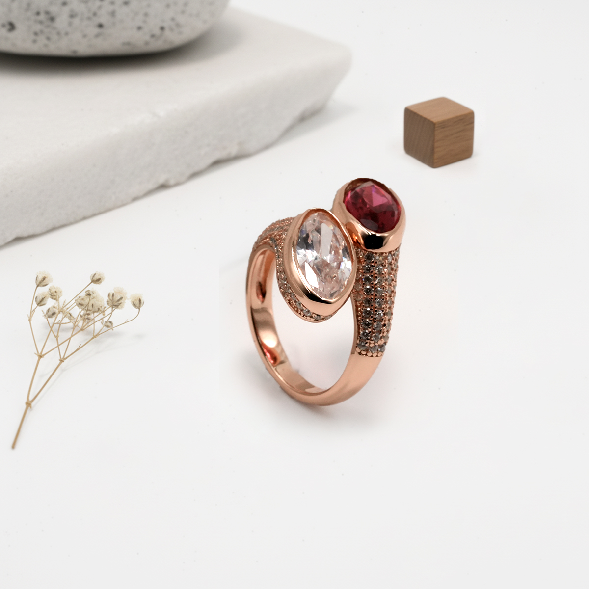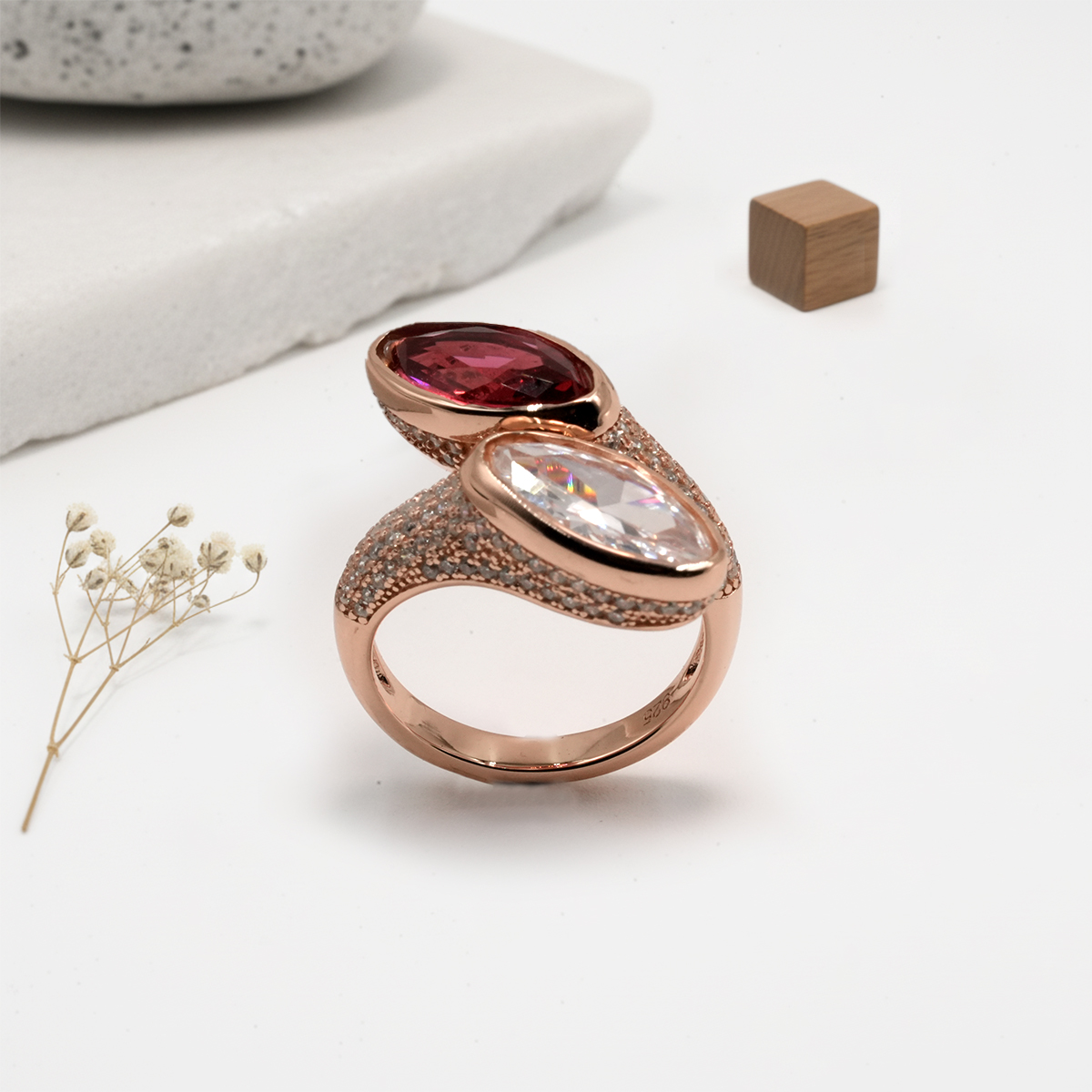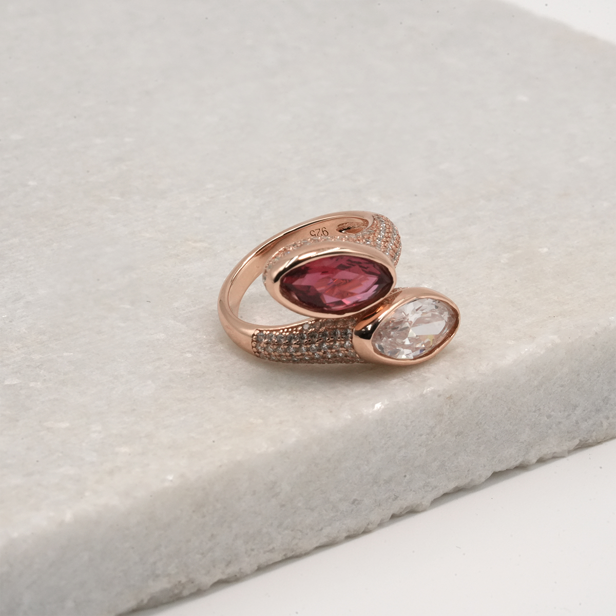 PREMIUM 925 SILVER ROSE GOLD POLISH RED & WHITE STONE – SIZE FREE